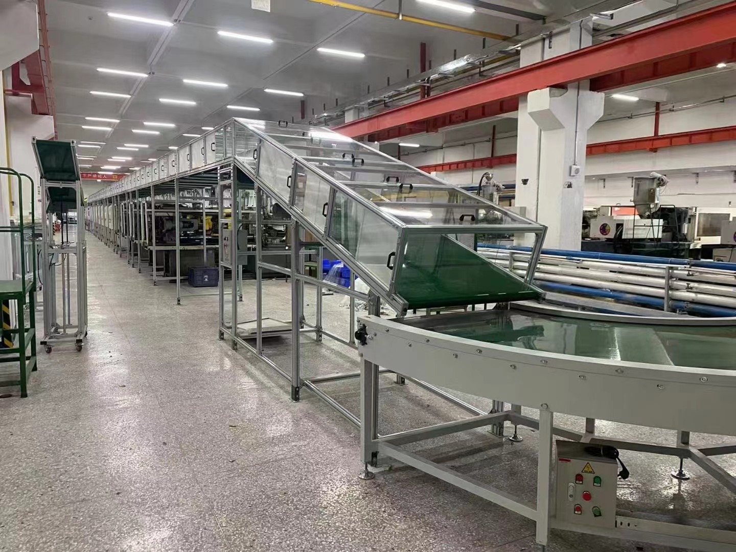 惠州市登辉注塑车间大型高空防尘自动化集中输送设备工程完成,欢迎有注塑车间的客户们参观指导